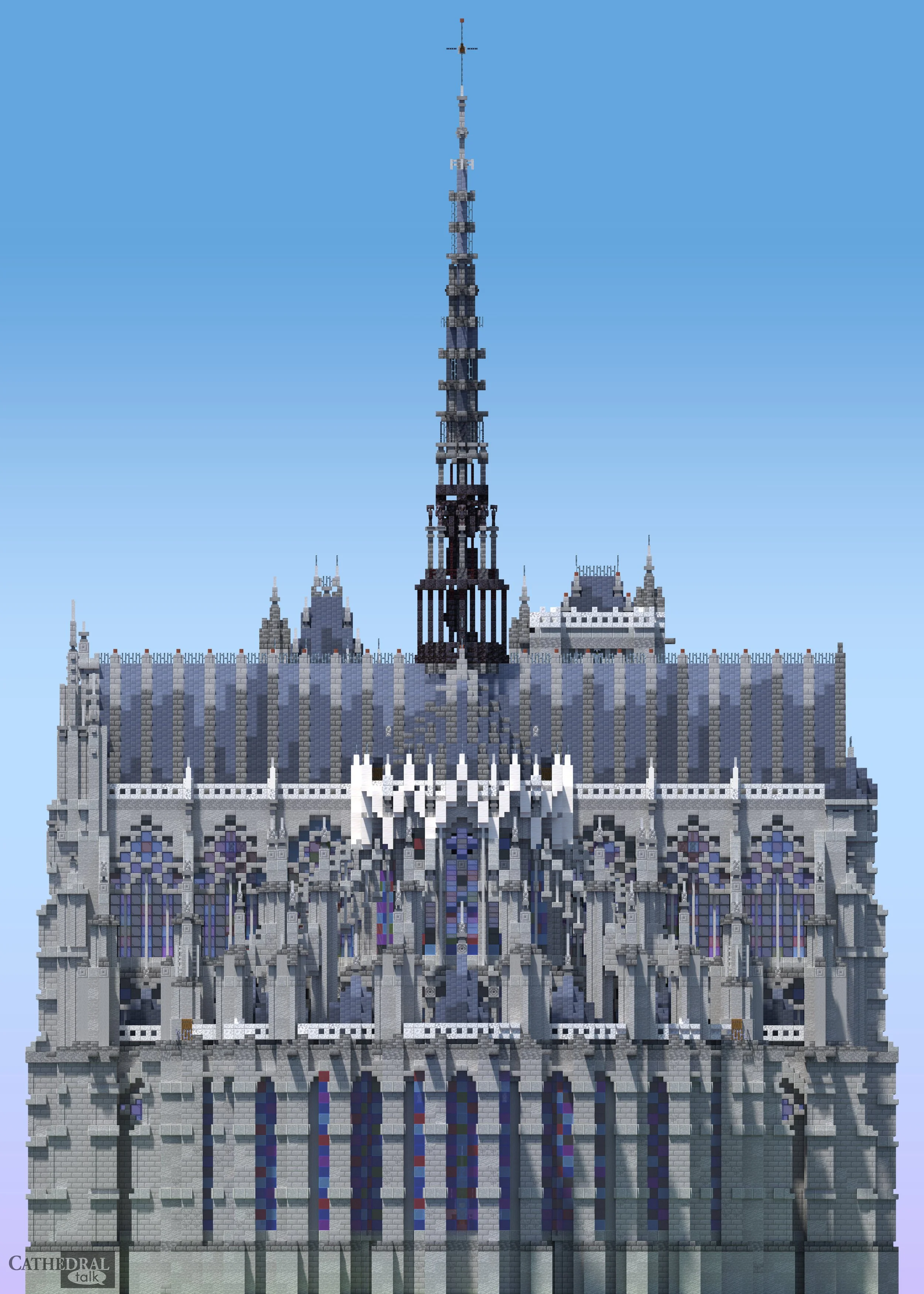 As with all my replica builds, my Amiens interior is fully complete. Since cathedrals are such a sprawling complex of passages, I was forced to make a few guesses on the locations of a couple passageways due to limited source-data, particularly in the western facade which has aisles upon aisles stacked as you ascend the many tiers of the elevation. However I am reasonably confident that my interpretation is quite close to the original. One detail I want more evidence for is the locations of the different bells in the towers; Amiens Cathedral has at least six primary bells (maybe more)—two bourdons and four lighter bells. However I am uncertain which bells are hung in which towers, so that is a detail I will update sometime in the future.